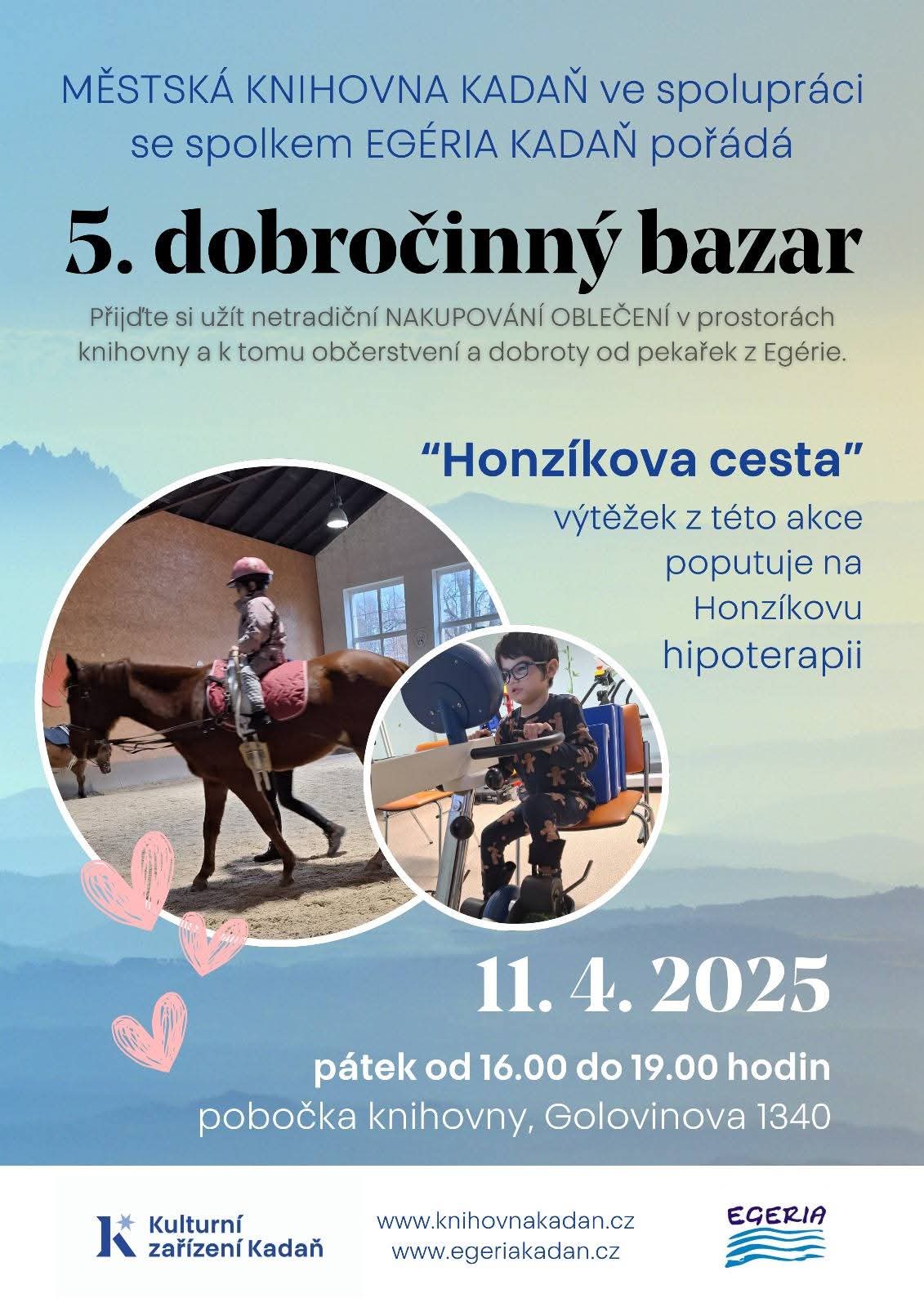 Milí PŘÁTELÉ …v pátek, 11. dubna se můžeme potkat na již 5. DOBROČINNÉM BAZARU v KADANI aneb HONZÍKOVA CESTA. MĚSTSKÁ KNIHOVNA KADAŇ ve spolupráci se